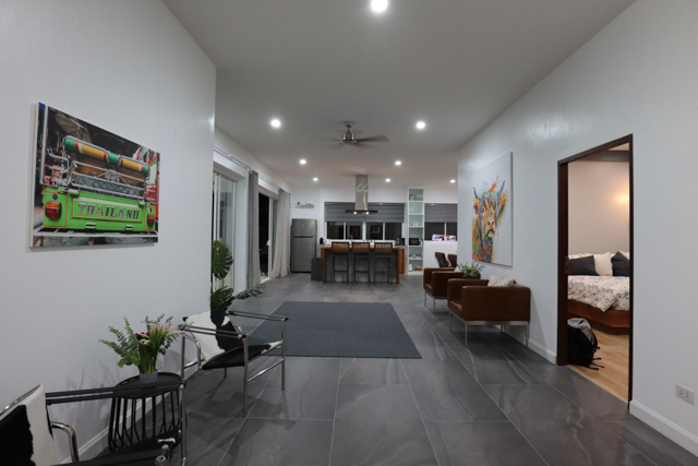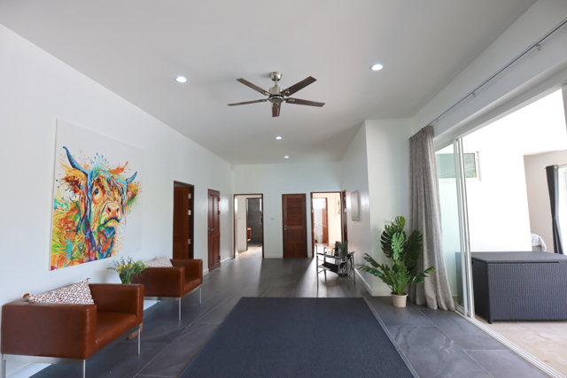 The villa has big sliding glass windows from the living area to the outside so just open them up and have the outside inside.